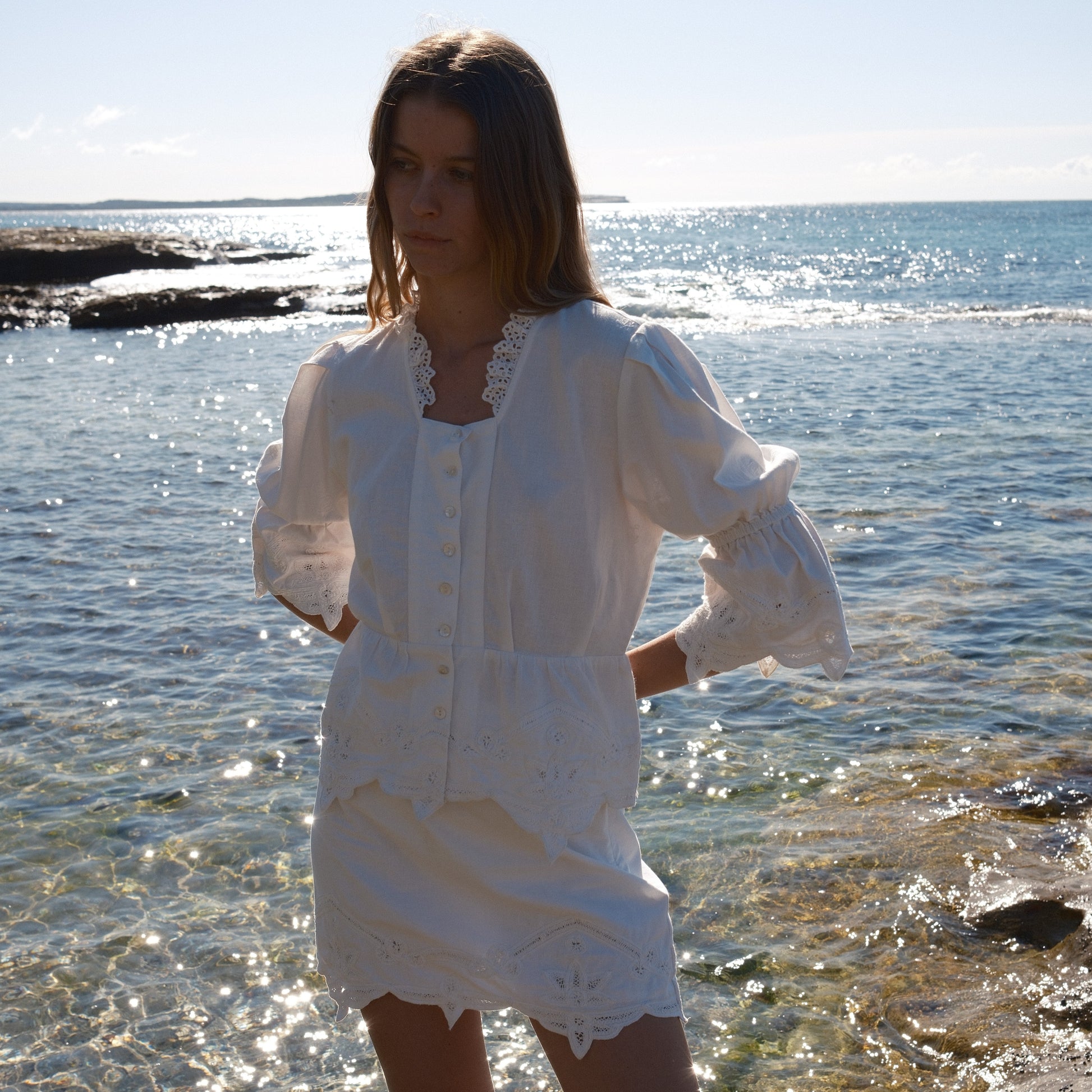 The sweetest blouse featuring a unique and flattering square neckline, voluminous sleeves, pleats at the waist and a custom cutwork embroidery. This cutwork embroidery is inspired by a cherished heirloom tablecloth and exudes vintage charm. Can be worn with the Rosie skirt or Rosie pant as a set or on its own. A perfect option for both day and evening wear.